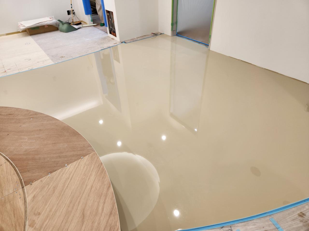 個人宅に洗い出し風塗床、ビッショットフレーク施工。床と立上りのベース色を分けメリハリある仕上げに。 改修工事でも対応可能となり厚みは約1㍉ですが下地クラック等もほとんど隠れてしまいます。