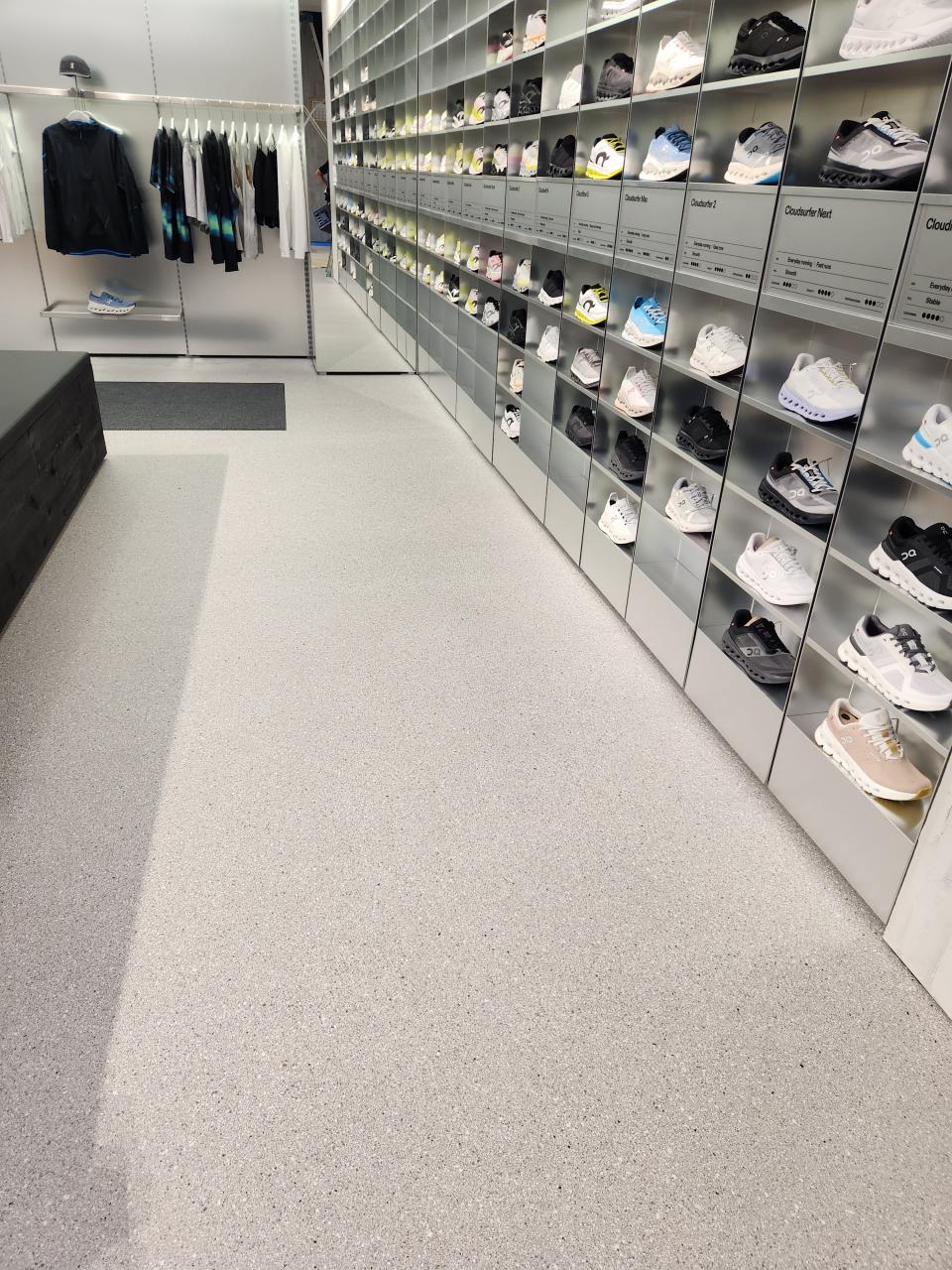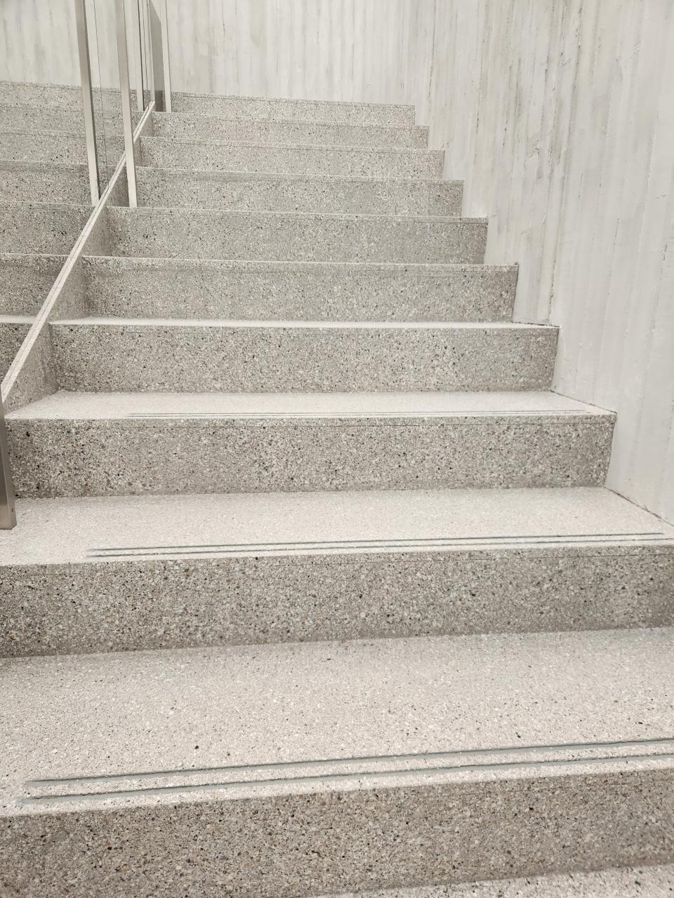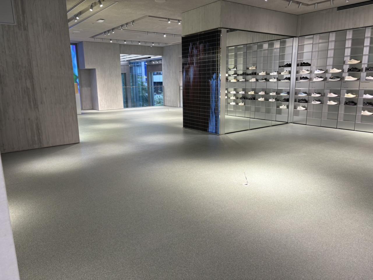 都内某スポーツ店にてビショットフレーク施工。階段、店舗床。 厚み約1mmと改修工事にも適応しています。 洗いだし風な仕上がり。