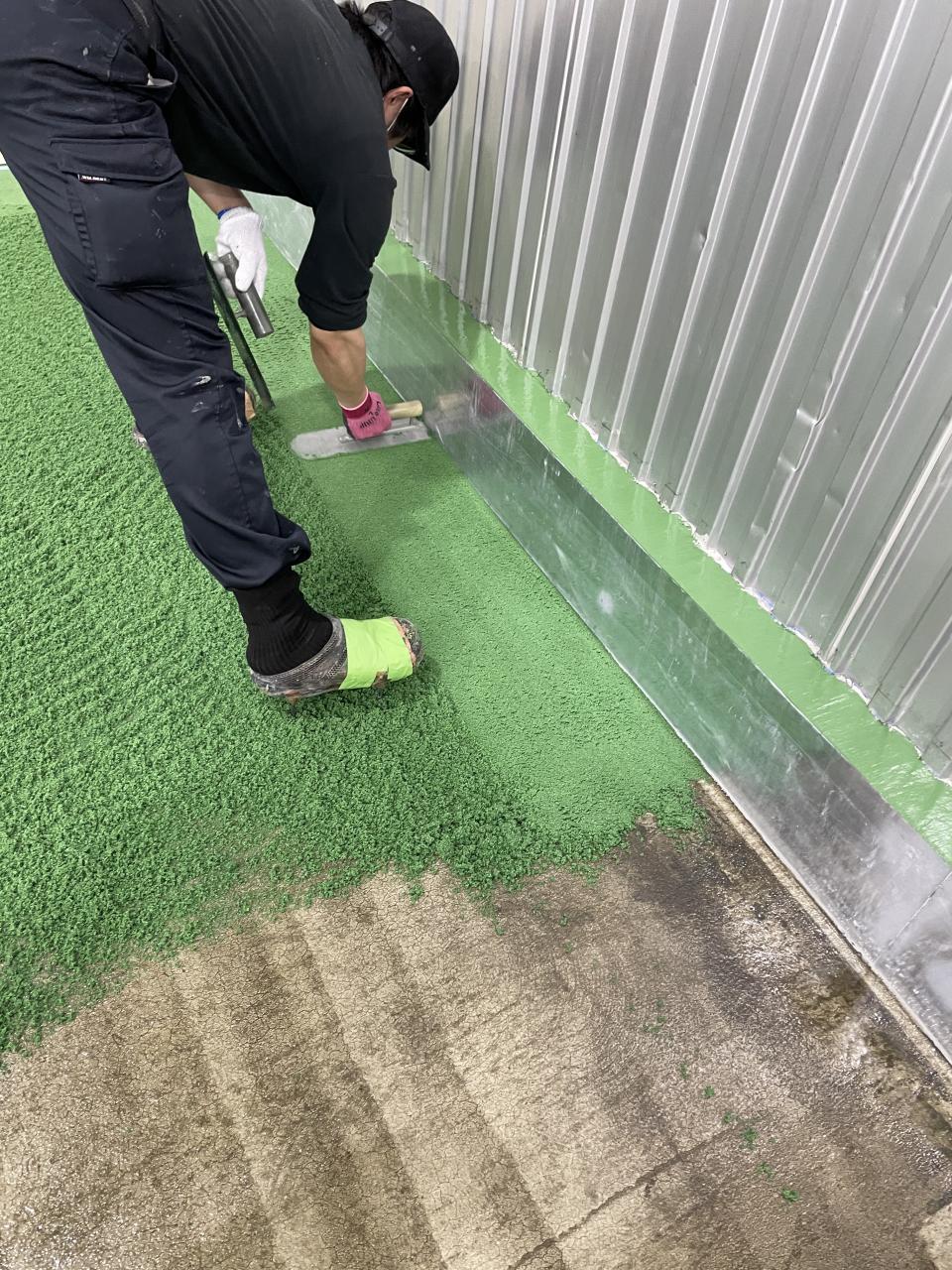 今回は某福祉施設屋上にて、防水、ゴムチップ舗装工事です。ポリウレア吹き付けリムスプレーにて防水処理後ゴムチップ舗装を施工。まだまだ暑い中での作業となるので空調服等で熱中症対策をしながらの施工となりました。 ゴムチップは弾性、透水性もあり公園、ゴルフ場、幼稚園などで多く施工させて頂いております。