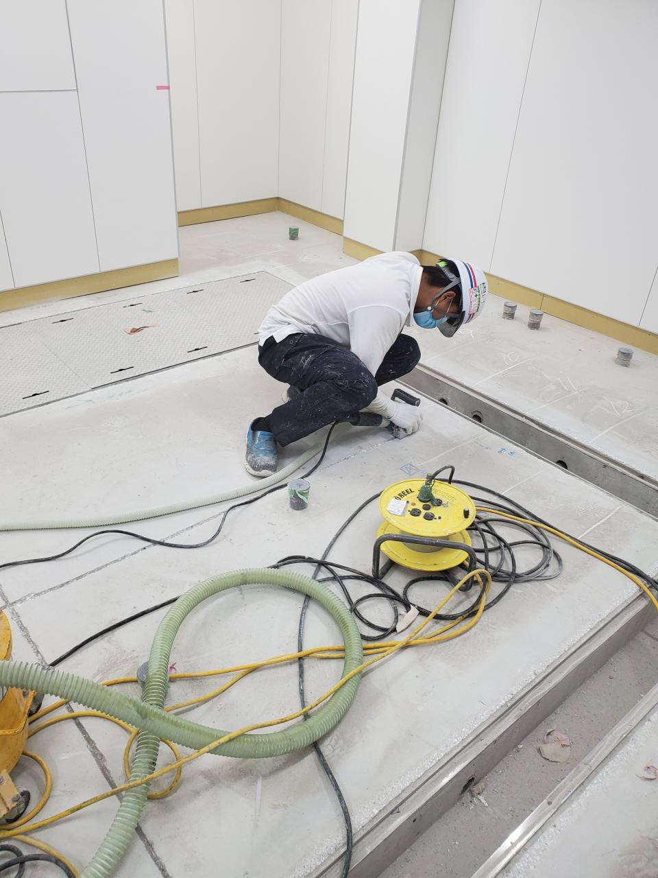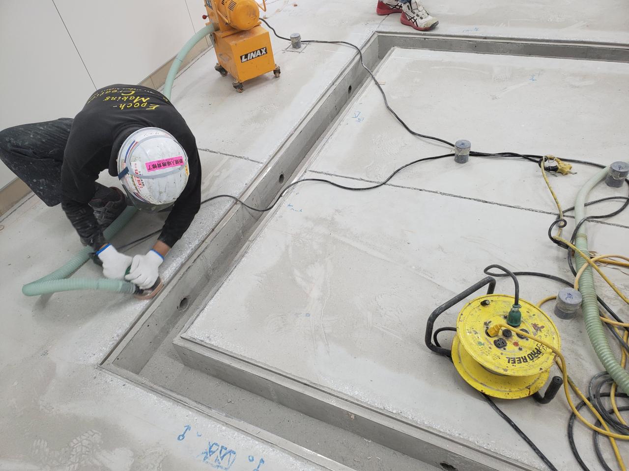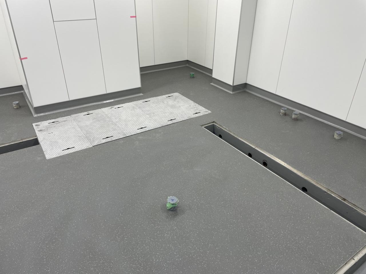 都内某ホテル厨房にてタフクリートMHを施工。 厚み約6ミリ、耐熱性、耐衝撃にかなり優れたもので臭気も殆んど出ず硬化も早いため現在の改修工事のでのスタンダードとなっている商品です。 今ある塗床材料の中でもトップレベルに耐久性もあるオールマイティーな機能を持つものとなっています。 接着剤となるプライマーを使用せず、カッターにて欠込目地を各所に事前に入れ、材料の持っている硬化収縮によって接着させます。